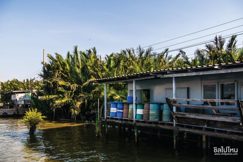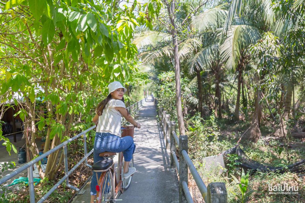 ก่อนจะปั่นจักรยานออกไปก็แวะไหว้พระที่วัดบางน้ำผึ้งนอกกันสักหน่อย เสริมสิริมงคลให้แก่การเที่ยวในครั้งนี้ เสร็จแล้วก็ไปตะลุยบางกะเจ้ากันเล้ยยยย สถานที่แรกที่เราจะไปก็คือ ตลาดน้ำบางน้ำผึ้ง ซึ่งเราเลือกที่จะปั่นเข้าตรอกเล็กๆ ที่อยู่ทางซ้ายมือของท่าเรือ ก็จะร่มรื่น ปั่นสบายๆ ใครที่กลัวจะหลงไม่ต้องกลัวเลยเพราะมีป้ายบอกทางตลอด (ออกทางวิสาหกิจชุมชนบ้านธูปหอม) แต่สำหรับใครที่อยากปั่นแบบสบายๆ ก็สามารถปั่นออกถนนใหญ่ได้เลย ทางไม่ซับซ้อน