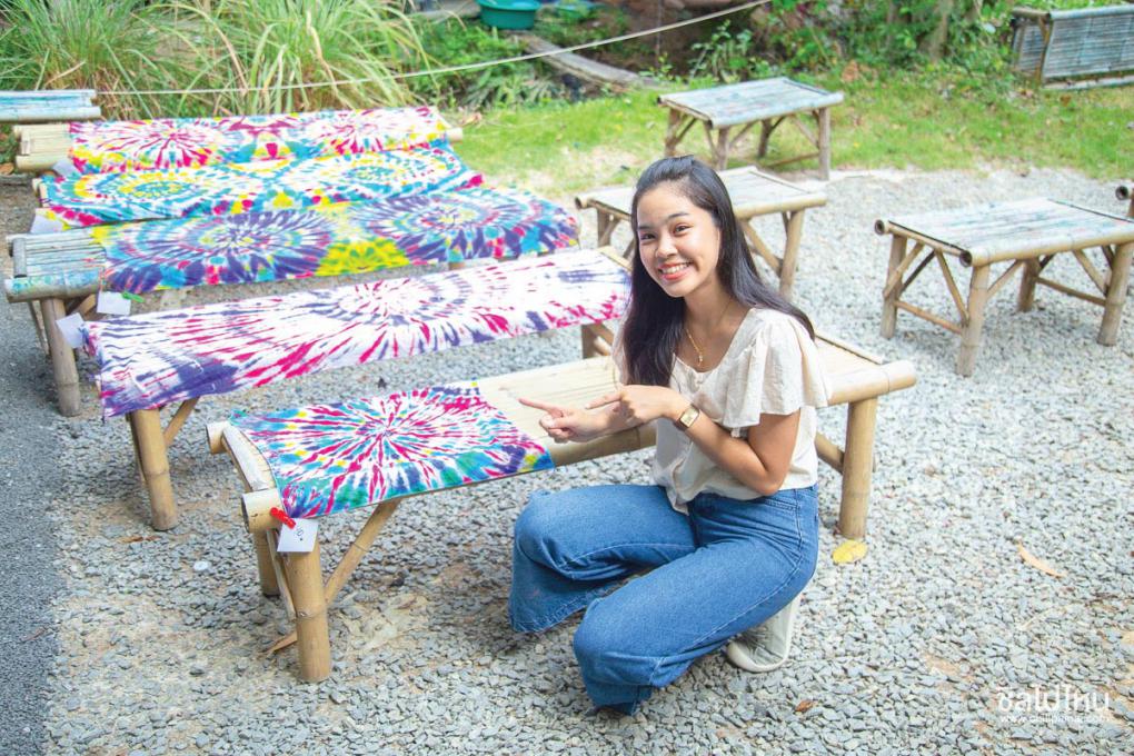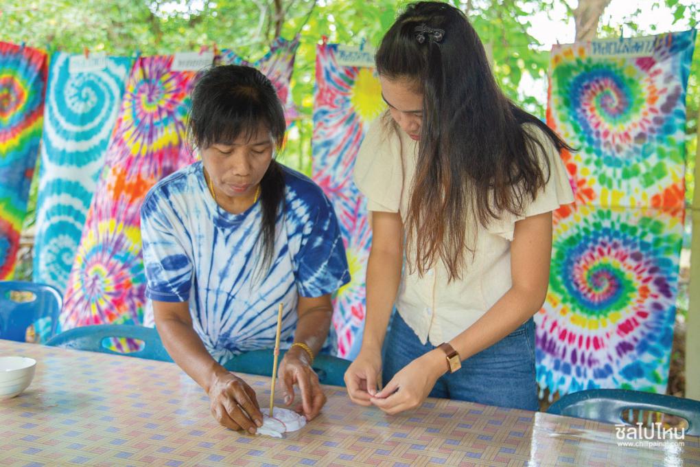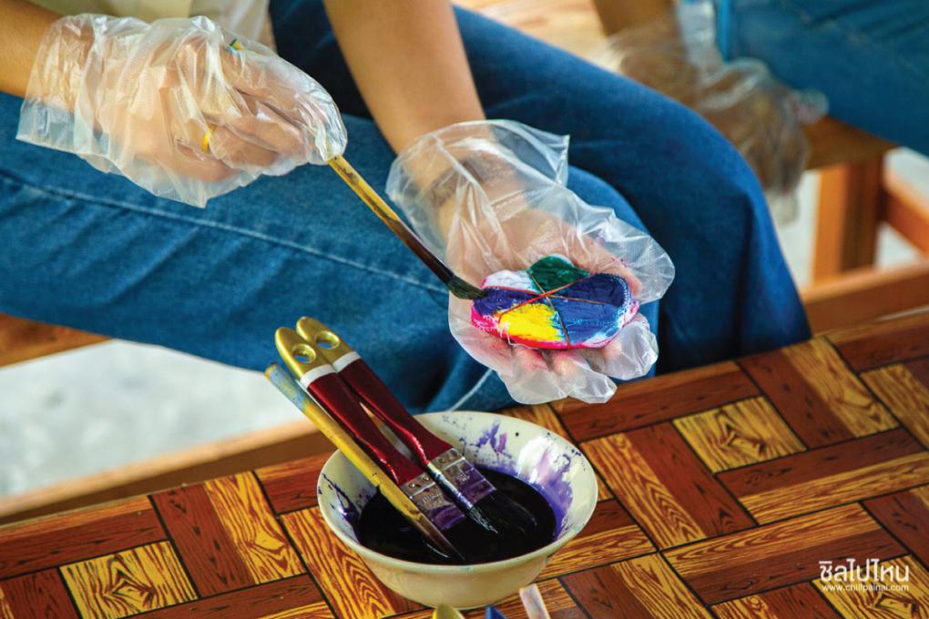 การทำผ้ามัดย้อมเย็นทำไม่ยุ่งยาก แค่ม้วนเป็นวงกลม มัดยาง ทุบๆ ก็สามารถนำไปลงสีได้แล้ว สำหรับใครที่คิดว่าทำไม่ได้แน่เลย อย่ากังวลค่ะ เพราะมีพี่ๆสอนอยู่ตลอด ไม่เละแน่นอน เรามาลงสีกันเลย การลงสีจะเป็นตัวสำคัญที่จะทำให้เกิดลาย ลายจะมีทั้งหอยใหญ่ หอยออร่า หอยใบไม้ ลายกนก ลายสี่เหลี่ยม เป็นต้น วันนี้เราจึงเลือกทำลายหอยออร่ากันค่า ลายนี้โดนใจสุดๆ ไปลงสีและดูผลงานของเรากัน !!