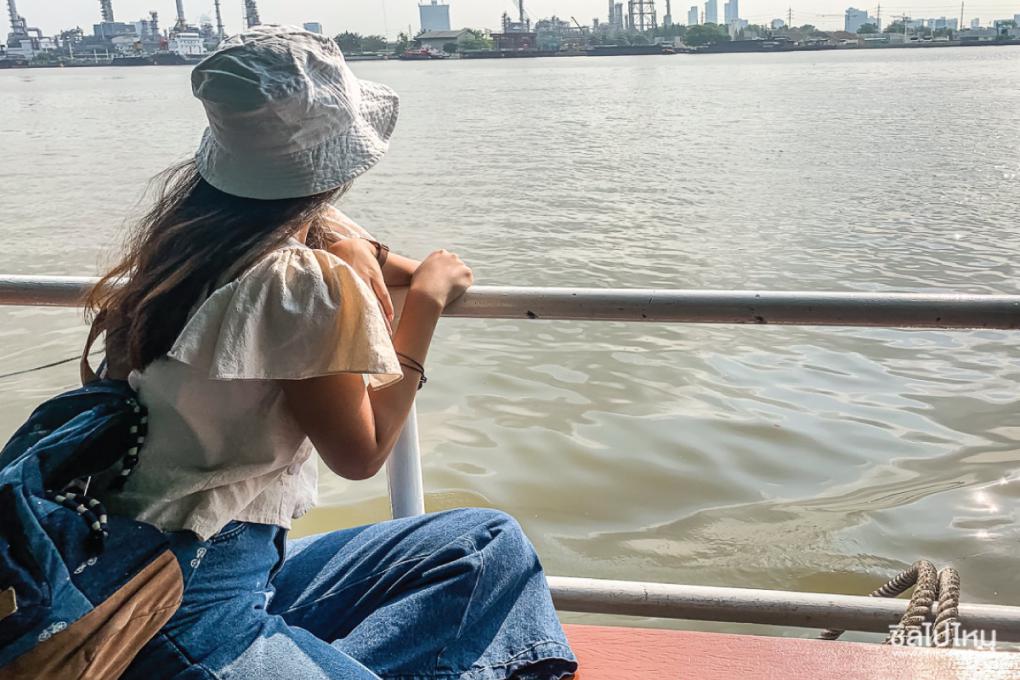 นั่งเรือรับลมเย็นๆ ชมวิว 2 ฝั่งริมแม่น้ำ ใช้เวลาไม่นาน ประมาณ 5 นาที เราก็ถึงท่าเรือวัดบางน้ำผึ้งนอกฝั่งบางกะเจ้ากันแล้ว เรือข้ามฟากที่นี่สามารถเอารถมอเตอร์ไซค์ขึ้นข้ามไปฝั่งบางกะเจ้าได้ด้วยนะ สะดวกมากๆเลย ขึ้นฝั่งแล้วก็อย่ารอช้าเดินมาจ่ายค่าเรือข้ามฟากคนละ 4 บาท แล้วก็พุ่งตัวไปเช่าจักรยานกันเลยยย ซึ่งค่าเช่าทั้งวันเพียง 50 บาทเท่านั้น ! แถมมีน้ำดื่ม ผ้าเย็นและแผนที่ปั่นจักรยานบริการให้ด้วย