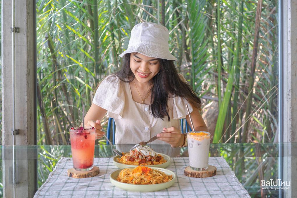 ทำกิจกรรมกันแบบเต็มอิ่มกันแล้ว ก็ถึงเวลาที่ท้องจะต้องอิ่มกันบ้าง ! ไปค่ะ มุ่งหน้าไปยังร้าน Hiddenwoods Café คาเฟ่ลึกลับท่ามกลางต้นไม้ใหญ่ บรรยากาศร่มรื่น ลมพัดเย็นสบาย แถมยังมีมุมถ่ายรูปเยอะมาก จะถ่ายมุมไหนก็สวยก็เลิศ แต่มุมที่ต้องมาถ่าย คือ ทางเดินตรงซุ้มต้นจาก ที่ถ่ายรูปออกมายังไงก็สวย ตอนนี้ท้องร้องดังละ เข้าไปกินอาหารกันเลยดีกว่า