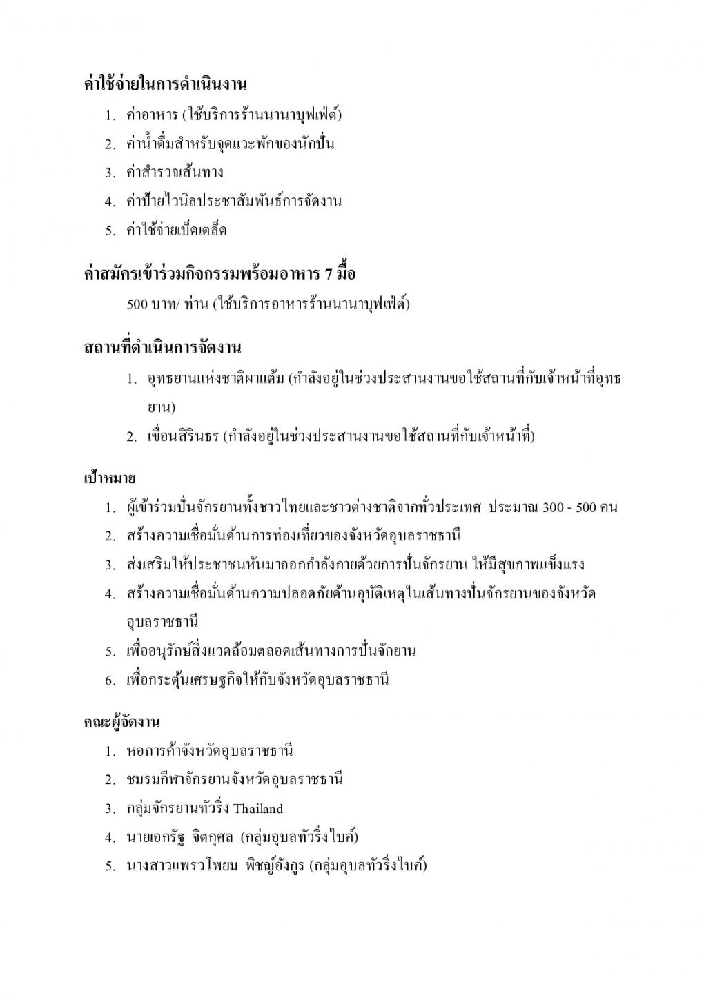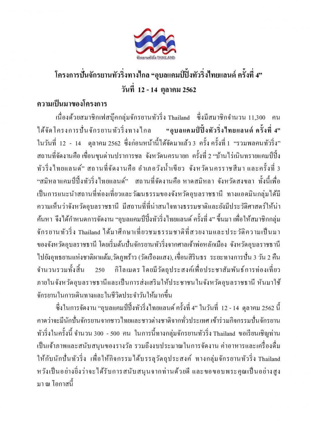 ความเป็นมาของโครงการ เนื่องดว้ยสมาชิกเฟสบุ๊คกลุ่มจักรยานทัวริ่ง Thailand ซ่ึงมีสมาชิกจา นวน 11,300 คน ได้จัดโครงการปั่นจักรยานทัวริ่งทางไกล “อุบลแคมป์ปิ้งทัวริ่งไทยแลนด์ ครั้งที่ 4” ในวนัที่ 12 - 14 ตุลาคม 2562 ซึ่งก่อนหนา้นี้ได้จัดมาแล้ว 3 ครั้ง ครั้งที่ 1 “รวมพลคนทัวริ่ง” สถานที่จดังานคือ เขื่อนขุนด่านปราการชล จงัหวดันครนายก ครั้งที่ 2 “บ้านไร่เนินทรายแคมป์ปิ้ง ทัวริ่งไทยแลนด์” สถานที่จัดงานคือ อ าเภอวังน ้าเขียว จังหวัดนครราชสีมา และครั้งที่ 3 “สมิหลาแคมป์ปิ้งทัวริ่งไทยแลนด์” สถานที่จดังานคือ หาดสมิหลา จงัหวดัสงขลา ทั้งนี้เพื่อ เป็นการแนะน าสถานที่ท่องเที่ยวและวัฒนธรรมของจังหวัดอุบลราชธานี ทางแอดมินกลุ่มได้มี ความเห็นว่าจังหวัดอุบลราชธานี มีสถานที่ที่น่าสนใจทางธรรมชาติและยังมีประวัติศาสตร์ให้น่า คน้หา จึงได้ก าหนดการจัดงาน “อุบลแคมป์ปิ้งทัวริ่งไทยแลนด์ ครั้งที่ 4” ขึ้นมา เพื่อให้สมาชิกกลุ่ม จักรยานทัวริ่ง Thailand ได้มาศึกษาเที่ยวชมธรรมชาติที่สวยงามและประวัติความเป็นมา ของจงัหวดัอุบลราชธานี โดยเริ่มต้นปั่นจักรยานทัวริ่งจากศาลเจ้าพ่อหลักเมือง จงัหวดัอุบลราชธานี ไปยังอุทธยานแห่งชาติผาแต้ม,วดัภูพร้าว (วดัเรืองแสง), เขื่อนสิรินธร ระยะทางการปั่น 3 วนั 2 คืน จา นวนรวมทั้งสิ้น 250 กิโลเมตร โดยมีวตัถุประสงค์เพื่อประชาสัมพันธ์การท่องเที่ยว ภายในจงัหวดัอุบลราชธานีและเป็นการส่งเสริมให้ประชาชนในจงัหวดัอุบลราชธานี หันมาใช้ จักรยานในการเดินทางและในชีวิตประจ าวันให้มากขึ้น ซ่ึงในการจดังาน “อุบลแคมป์ปิ้งทัวริ่งไทยแลนด์ ครั้งที่ 4” ในวนัที่ 12 - 14 ตุลาคม 2562 นี้ คาดว่าจะมีนักปั่นจักรยานจากชาวไทยและชาวต่างชาติจากทั่วประเทศ เข้าร่วมกิจกรรมปั่นจักรยาน ทัวริ่งในครั้งนี้ จา นวน 300 - 500 คน ในการนี้ทางกลุ่มจักรยานทัวริ่ง Thailand ขอเรียนเชิญท่าน เป็นเจา้ภาพและสนับสนุนของรางวลั รวมถึงงบประมาณในการจดังาน ค่าอาหารและเครื่องดื่ม ให้กับนักปั่นทัวริ่ง เพื่อให้กิจกรรมได้บรรลุวัตถุประสงค์ ทางกลุ่มจักรยานทัวริ่ง Thailand หวังเป็นอย่างยิ่งว่าจะได้รับการสนับสนุนจากท่านด้วยดี และขอขอบพระคุณเป็นอย่างสูง มา ณ โอกาสนี้