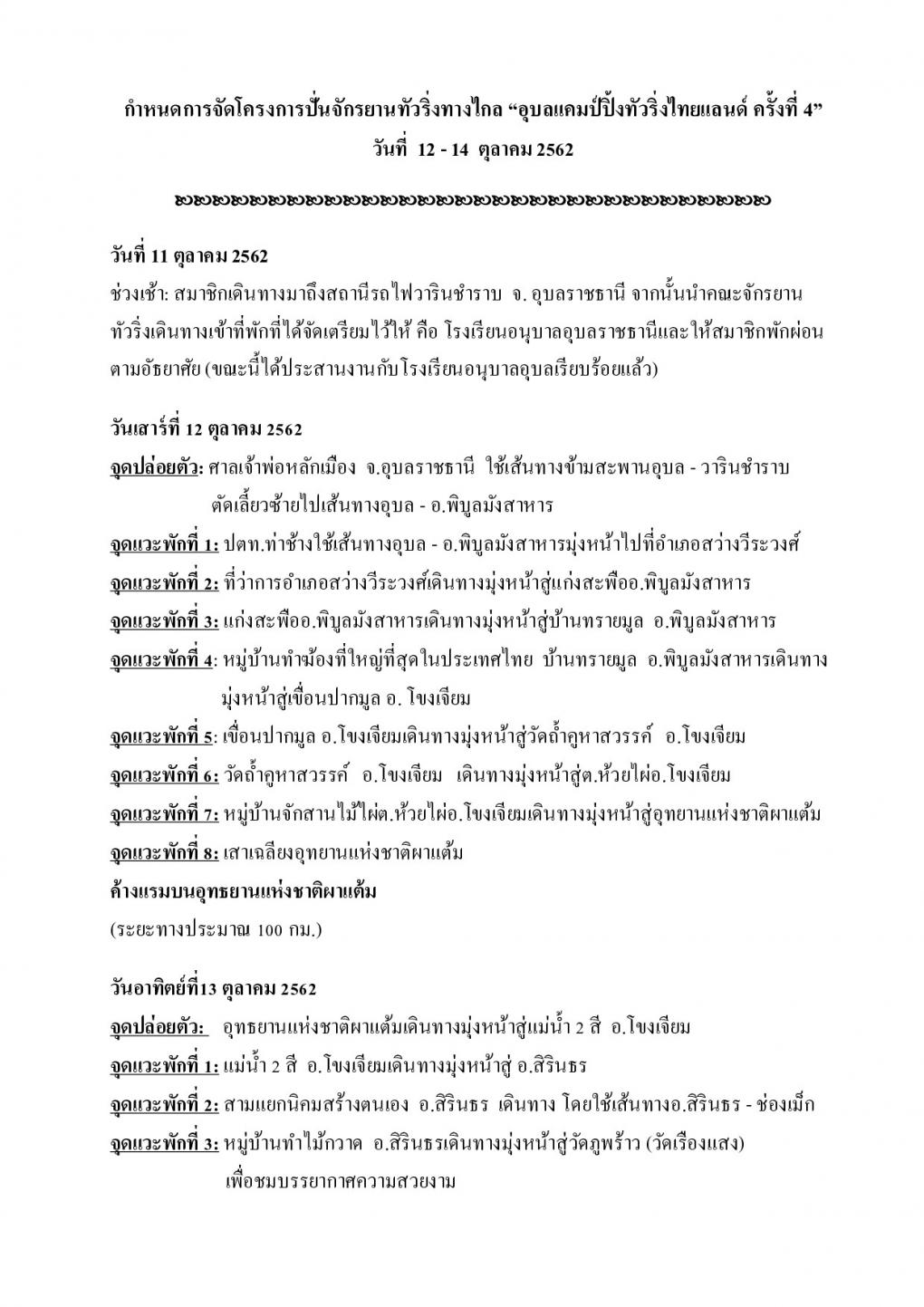 ความเป็นมาของโครงการ เนื่องดว้ยสมาชิกเฟสบุ๊คกลุ่มจักรยานทัวริ่ง Thailand ซ่ึงมีสมาชิกจา นวน 11,300 คน ได้จัดโครงการปั่นจักรยานทัวริ่งทางไกล “อุบลแคมป์ปิ้งทัวริ่งไทยแลนด์ ครั้งที่ 4” ในวนัที่ 12 - 14 ตุลาคม 2562 ซึ่งก่อนหนา้นี้ได้จัดมาแล้ว 3 ครั้ง ครั้งที่ 1 “รวมพลคนทัวริ่ง” สถานที่จดังานคือ เขื่อนขุนด่านปราการชล จงัหวดันครนายก ครั้งที่ 2 “บ้านไร่เนินทรายแคมป์ปิ้ง ทัวริ่งไทยแลนด์” สถานที่จัดงานคือ อ าเภอวังน ้าเขียว จังหวัดนครราชสีมา และครั้งที่ 3 “สมิหลาแคมป์ปิ้งทัวริ่งไทยแลนด์” สถานที่จดังานคือ หาดสมิหลา จงัหวดัสงขลา