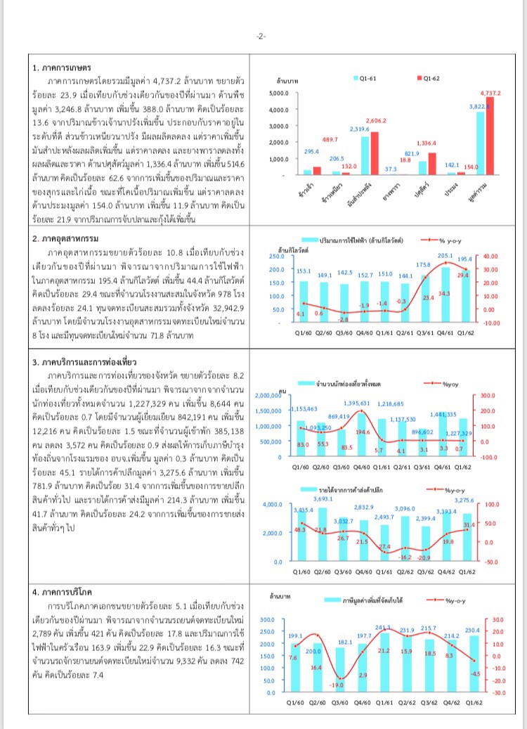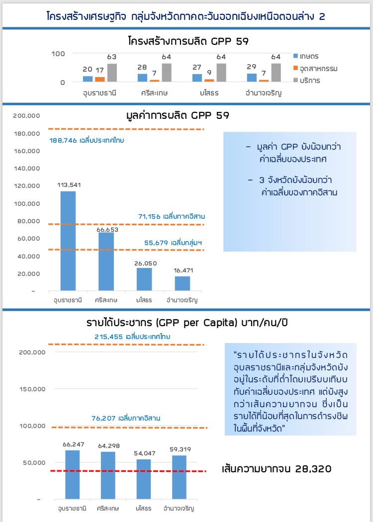 เศรษฐกิจกลุ่มจังหวัดภาคตะวันออกเฉียงเหนือตอนล่าง 2 ขยายตัวร้อยละ 5.2 จาก การบริโภคภาคเอกชนขยายตัวได้ในระดับที่ดี โดยได้รับปัจจัยสนับสนุนจากการบริโภคของประชาชนในพื้นที่ ได้แก่รายได้เกษตรกรที่เพิ่มขึ้นตามระดับราคาสินค้าเกษตร และแนวโน้มจำนวนนักท่องเที่ยวที่เพิ่มขึ้น เห็นได้จากจำนวนรถยนต์นั่งส่วนบุคคลจดทะเบียนใหม่ เพิ่มขึ้นถึง ร้อยละ 21.9 สะท้อนถึงรายได้ของประชาชนในพื้นที่ที่เพิ่มขึ้น ประกอบกับการลงทุนภาคเอกชนขยายตัวได้ต่อเนื่อง อย่างไรก็ตามการใช้จ่ายงบประมาณภาครัฐยังไม่ดีเท่าที่ควร แม้งบประมาณที่ได้รับจัดสรรในพื้นที่ค่อนข้างมาก