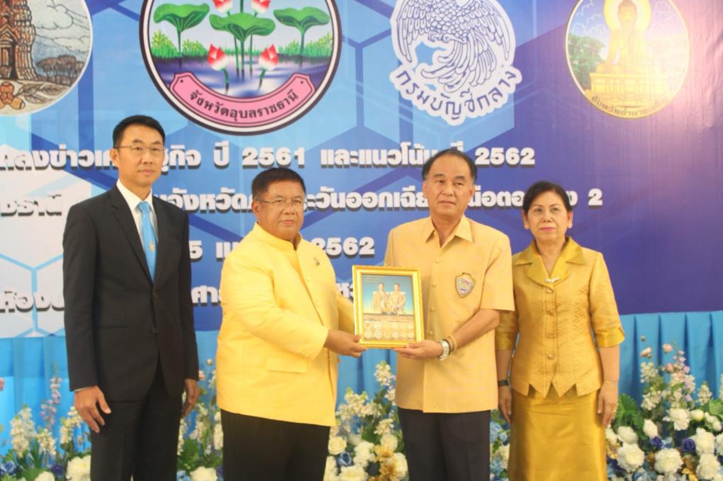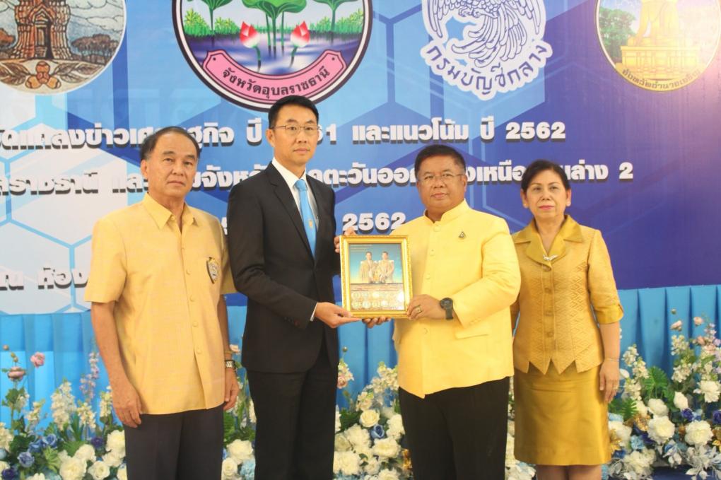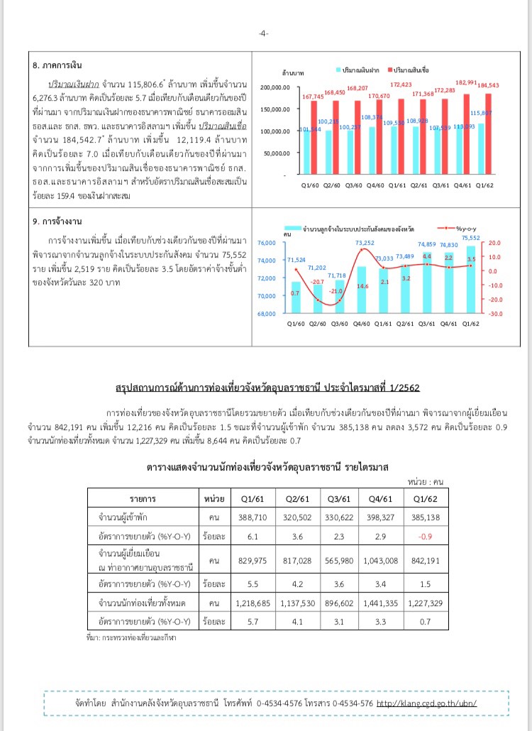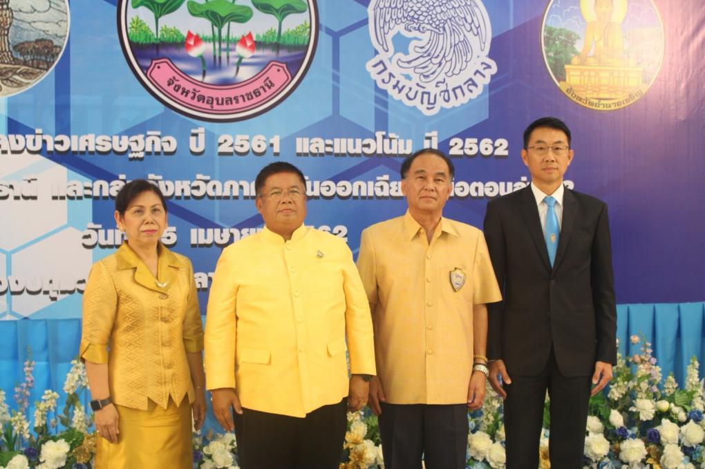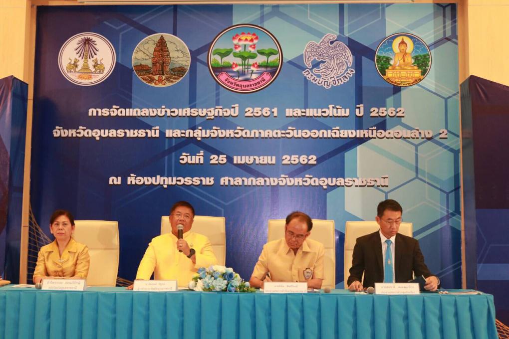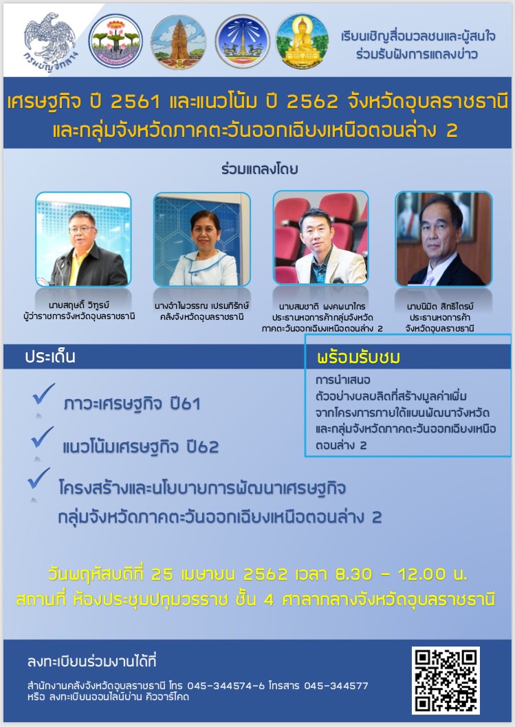 วันที่ 25 เม.ย. 2562 เวลา 10.00 – 12.00 น. ณ ห้องประชุมปทุมวาราช ชั้น 4 ศาลากลางจังหวัดอุบลราชธานี จังหวัดอุบลราชธานี โดยสำนักงานคลังจังหวัดอุบลราชธานี “แถลงข่าวเศรษฐกิจ ปี 2561 และแนวโน้ม ปี 2562 จังหวัดอุบลราชธานีและกลุ่มจังหวัดภาคตะวันออกเฉียงเหนือตอนล่าง 2” พร้อมนำเสนอ ตัวอย่างผลิตผลิตภัณฑ์ที่สร้างมูลค่าเพิ่มจากโครงการภายใต้แผนพัฒนาจังหวัดและกลุ่มจังหวัดภาคตะวันออกเฉียงเหนือตอนล่าง 2 โดยมีผู้แถลงข่าว นำโดย นายสฤษดิ์ วิฑูรย์ ผู้ว่าราชการจังหวัดอุบลราชธานี นายนิมิต สิทธิไตรย์ ประธานหอการค้าจังหวัดอุบลราชธานี นายสมชาติ พงคพนาไกร ประธานหอการค้ากลุ่มจังหวัด ภาคตะวันออกเฉียงเหนือตอนล่าง 2 และนางอำไพวรรณ เปรมภิรักษ์ คลังจังหวัดอุบลราชธานี เพื่อเผยแพร่ข้อมูลเศรษฐกิจการคลังจังหวัดอุบลราชธานีและเศรษฐกิจกลุ่มจังหวัดภาคตะวันออกเฉียงเหนือตอนล่าง 2 ปี 2561 และแนวโน้มปี 2562