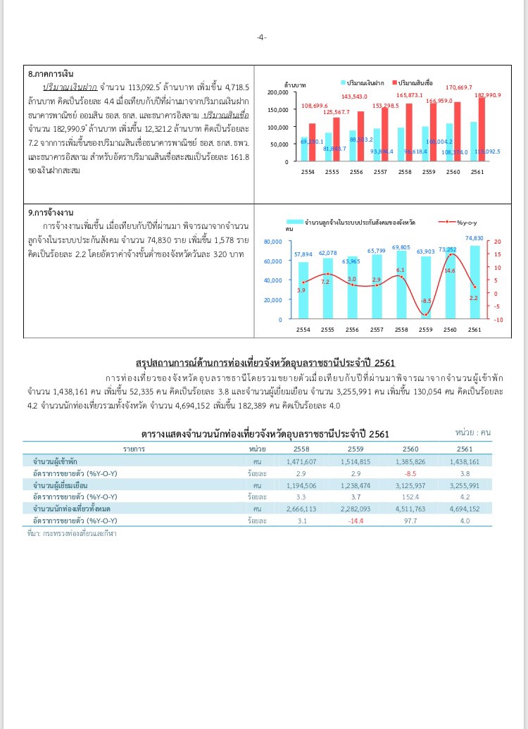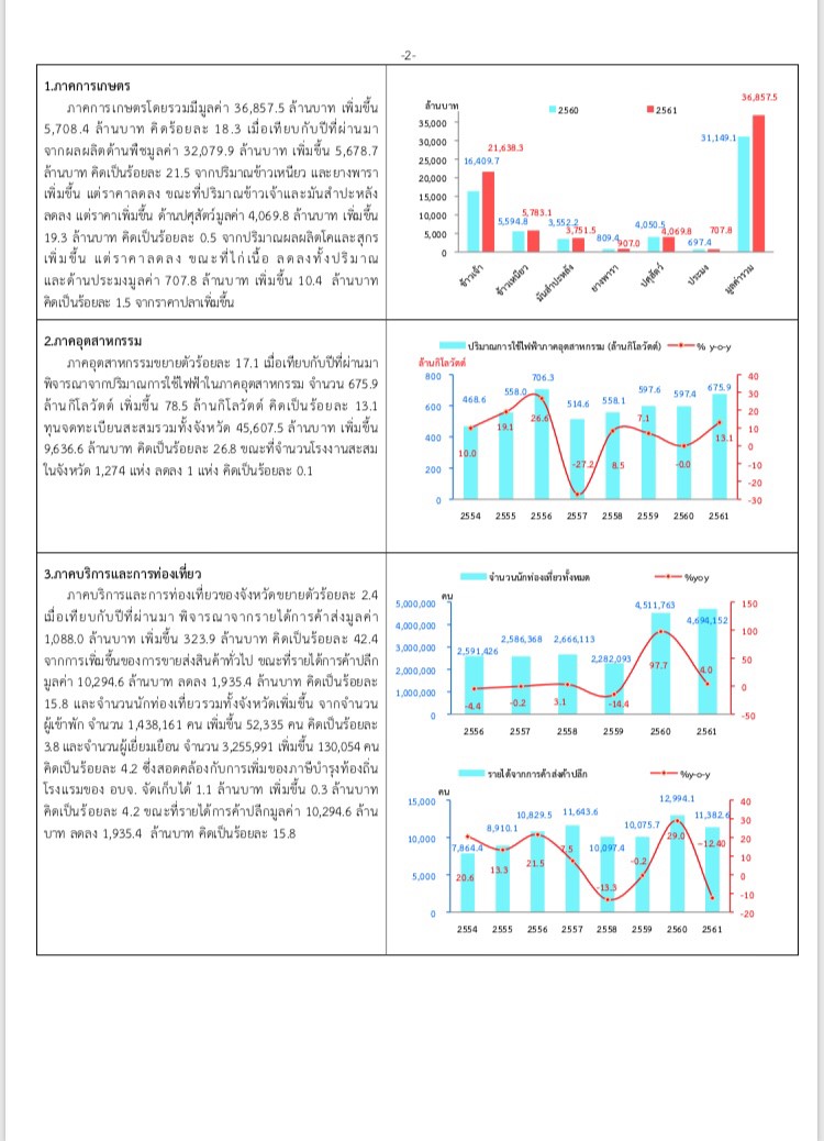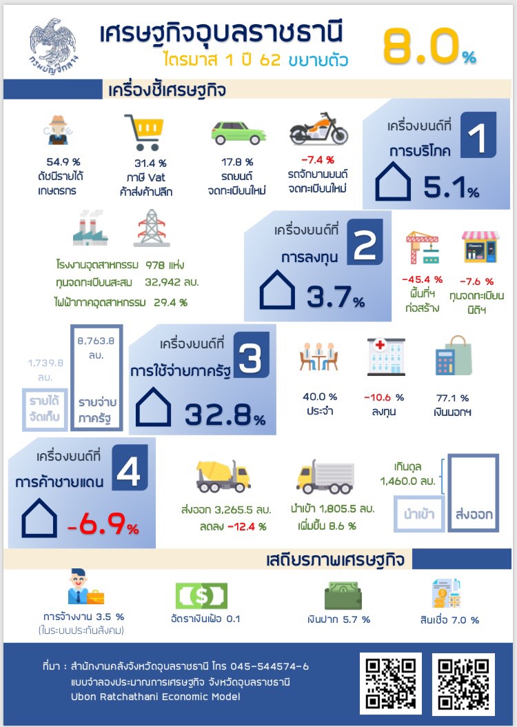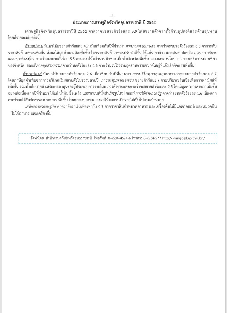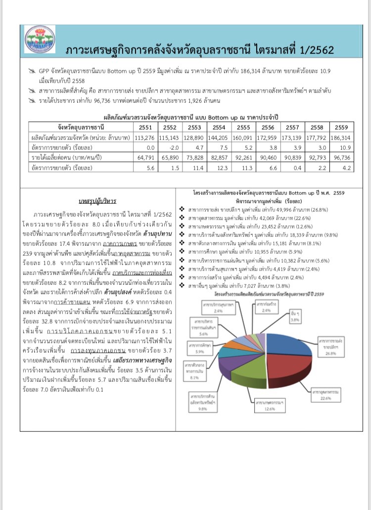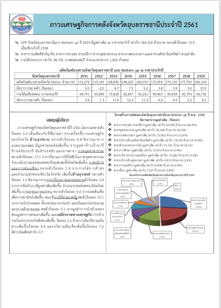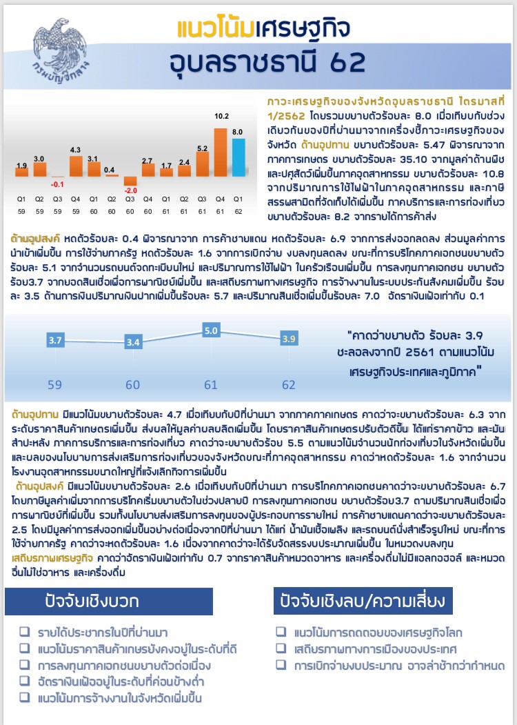 โดยปี 2561 เศรษฐกิจจังหวัดอุบลราชธานี สดใส ขยายตัวร้อยละ 5.0 เป็นไปในทิศทางเดียวกับเศรษฐกิจภาค และประเทศ จากการบริโภคภาคเอกชนขยายตัวถึงร้อยละ 5.4 โดยเฉพาะในการซื้อสินค้ากลุ่มรถยนต์ สะท้อนรายได้ของประชาชนระดับกลางที่เพิ่มขึ้น รวมทั้ง ผลของการกระตุ้นการบริโภคจากนโยบายภาครัฐ (ประชารัฐสวัสดิการ) และรายได้เกษตรกรที่เพิ่มขึ้นจากราคาสินค้าเกษตรปรับตัวดีขึ้น อย่างไรก็ตามการเบิกจ่ายเงิน ของแผ่นดินยังน้อยกว่าเป้าหมายที่กำหนด ส่งผลให้เศรษฐกิจจังหวัดขยายตัวได้น้อยกว่าที่ควร ส่วนเศรษฐกิจปี 2562 คาดว่าจะขยายตัวในอัตราที่ชะลอลง ตามแนวโน้มของเศรษฐกิจภูมิภาค