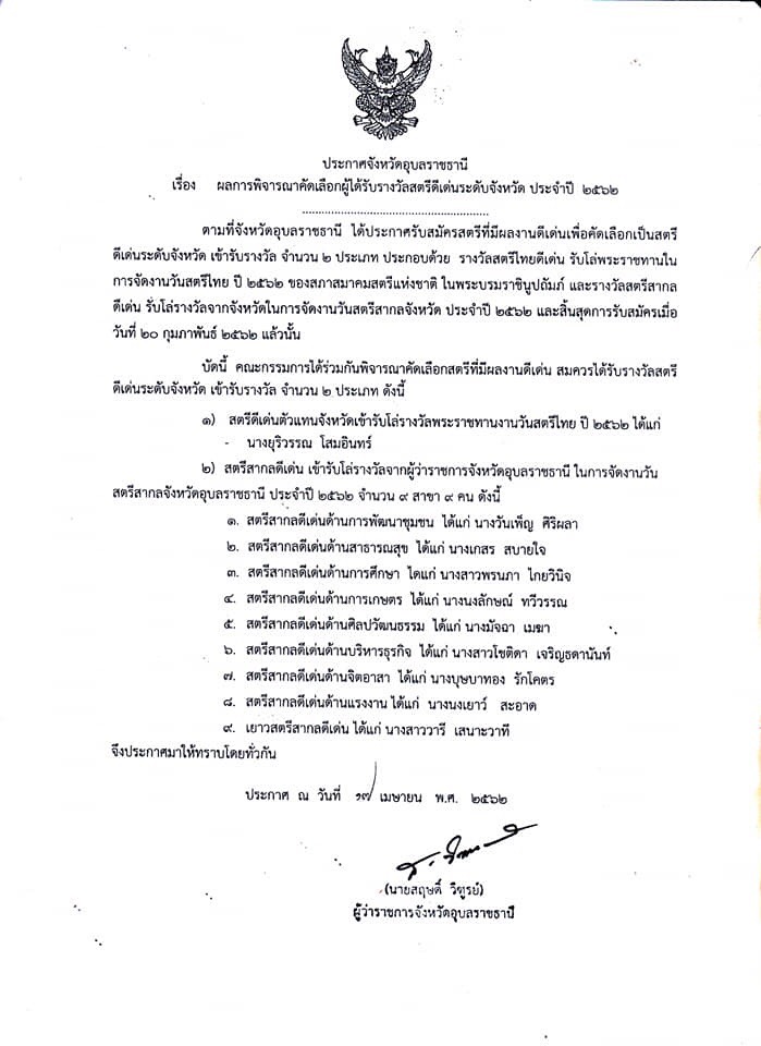หอการค้าจังหวัดอุบลราชธานี นำโดย นางเพ็ญพักตร ศรีทอง ประธานกรรมการกิตติมศักดิ์หอการค้าจังหวัดอุบลราชธานี พร้อมด้วยนางรัตนากร ฑีฆธนานนท์ กรรมการเลขาธิการหอการค้าจังหวัดอุบลราชธานี นางสริตา ปรีดาสันติ์ รองประธานกรรมการหอการค้าจังหวัดอุบลราชธานี นางมลิวัลย์ ไชยสงคราม รองประธานกรรมการหอการค้าจังหวัดอุบลราชธานี นางกรุณา คณานิจกิจไพบูลย์ กรรมการบริหารหอการค้าจังหวัดอุบลราชธานี ร่วมงานพิธีมอบโล่รางวัลแก่สตรีดีเด่นระดับจังหวัดประจำปี 2562 โดยได้รับการคัดเลือกเป็นสตรีดีเด่น ระดับจังหวัด เข้ารับรางวัล จำนวน 2 ประเภทประกอบด้วย