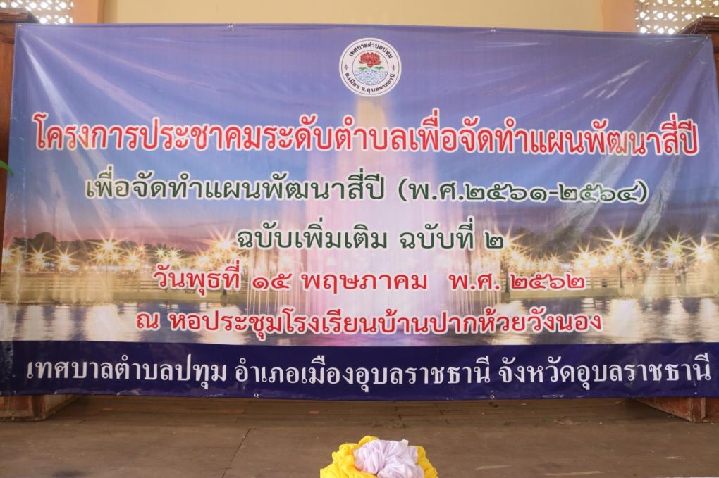 วันที่ 15 พฤษภาคม 2562 เวลา 08:30-12:00 น. ณ โรงเรียนบ้านปากห้วยวังนอง ตำบลปทุมอำเภอเมือง จังหวัดอุบลราชธานี นางบัวหลวง อาษาพล รองประธานกรรมการหอการค้าจังหวัดอุบลราชธานี ร่วมโครงการประชาคมตำบลเพื่อจัดทำสี่ปี (พ.ศ. 2561-2564) ฉบับเพิ่มเติม ฉบับที่ 2