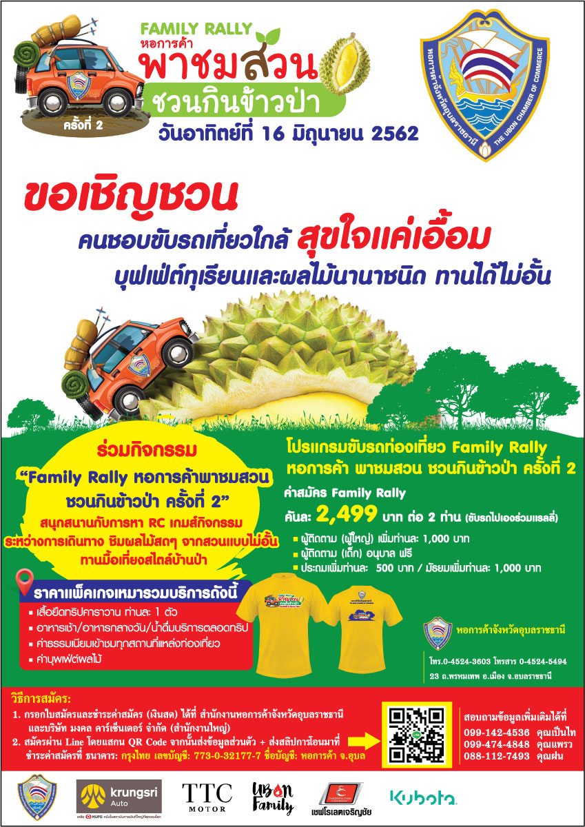 ขับรถเที่ยวใกล้สุขใจแค่เอื้อม “หอการค้า พาชมสวน ชวนกินข้าวป่า family Rally ครั้งที่ 2” #ในวันอาทิตย์ที่ 16 มิถุนายน 2562 #ณ อ.น้ำยืน จ.อุบลราชธานี 🚙 เชิญร่วมกิจกรรมแรลลี่ 🚗 สนุกสนานกับการหา RC เกมส์กิจกรรมระหว่างการเดินทาง ทานบุฟเฟ่ต์ทุเรียน ผลไม้สด ๆ จากสวนและเมนูทุเรียนหลากหลาย พร้อมทั้งชิงถ้วยรางวัลแรลลี่ ที่ 1 - 3 จากท่านผู้ว่าราชการ และรางวัลบู้บี้