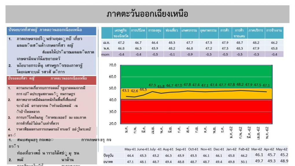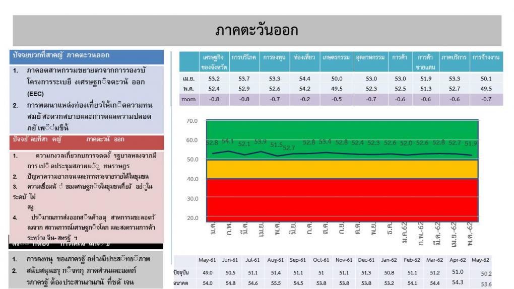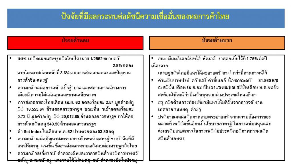 ดัชนีความเชื่อมั่นหอการค้าไทย ประจำเดือนพฤษภาคม 2562 กนง. มีมติเอกฉันท์ให้คงอัตราดอกเบี้ยไว้ที่ 1.75 1.75% ต่อปี เนื่องจากเศรษฐกิจไทยมีแนวโน้มขยายตัวต่ากว่าที่คาดการณ์ไว้ ค่าเงินบาทปรับตัวแข็งค่าขึ้นเล็กน้อยจากระดับ 31.860 31.860 31.860 ฿/$ ณสิ้นเดือน เม.ย. 62 เป็น 31.796 31.796 31.796 ฿/$ ณ สิ้นเดือน พ.ค. 62 ซึ่งสะท้อนให้เห็นว่ามีเงินทุนจากต่างประเทศไหลเข้ามา