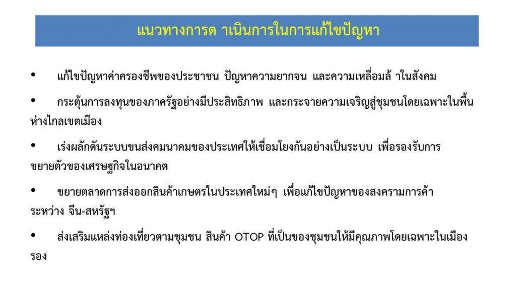 • กระตุ้นการลงทุนของภาครัฐอย่างมีประสิทธิภาพ และกระจายความเจริญสู่ชุมชนโดยเฉพาะในพื้นห่างไกลเขตเมือง