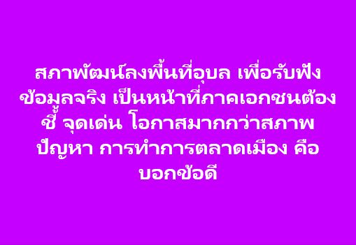 จึงเป็นหน้าที่ต้อง นำเสนอ ข้อมูลเชิง ศักยภาพ จุดเด่น และโอกาส และ ตอบข้อถาม ในจุดอ่อนให้ เห็นว่า แก้ไขได้ (ถือเป็นการทำตลาดให้ กับจังหวัดอุบล) อุบลมีดี กว่า ที่รุู้ ที่ เห็นอีกมาก