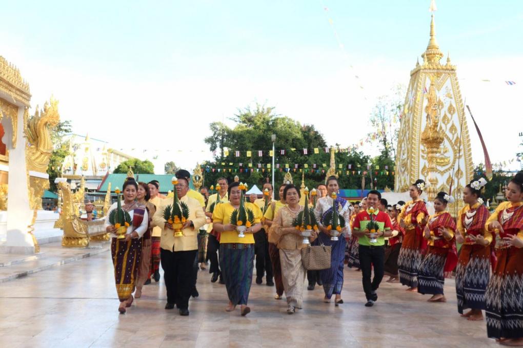 ผู้ว่าราชการจังหวัดอุบลราชธานี นำคณะรับขันหมากเบ็ง นำเดินรอบพระธาตุฯ 3 รอบ เข้านมัสการเจ้าอาวาสวัดพระธาตุหนองบัว และสักการะองค์พระธาตุ และเยี่ยมชมกิจกรรม “ ท่องธรรมในเทียน ยลเทียนในสวน” ต้นเทียนประเภทแกะสลักประเภทติดพิมพ์ และประเภทเทียนโบราณ