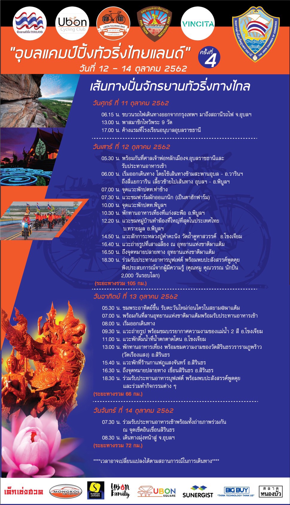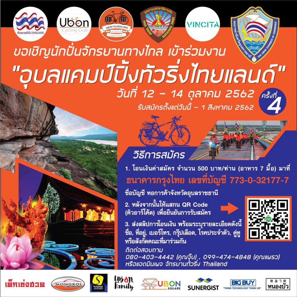 กิจกรรมปั่นจักรยาน “อุบลแคมป์ปิ้งทัวริ่งไทยแลนด์”(ครั้งที่ 4) จัดในวันที่ 12-14 ต.ค.62 (3 วัน) อุบล-ผาแต้ม-เขื่อนสิรินธร