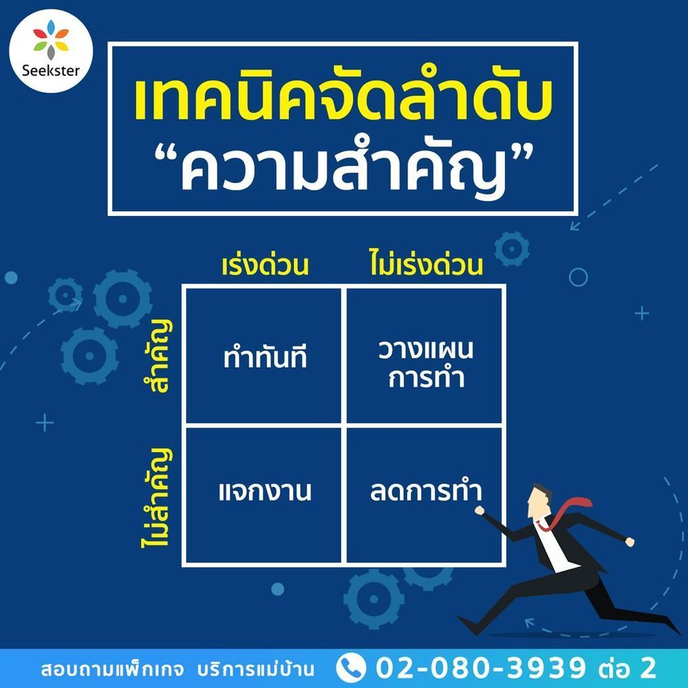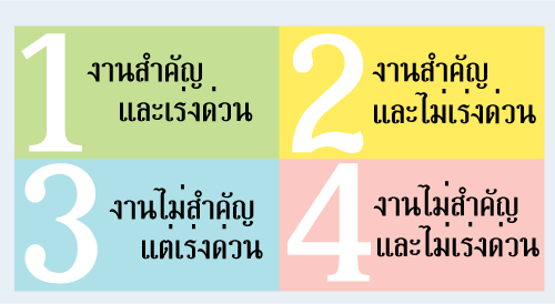 4 ช่อง คือ......1.สำคัญ - เร่งด่วน > ทำ...2.สำคัญ - ไม่เร่งด่วน > วางแผนให้ดี ตรงนี้จุดนี้สำคัญสุด เพราะเรามักจะไม่มีเวลาให้ช่องนี้ 3.ไม่สำคัญ - เร่งด่วน > พยายามให้คนอื่นทำแทน....4.ไม่สำคัญ - ไม่เร่งด่วน > พยายามกำจัดทิ้ง