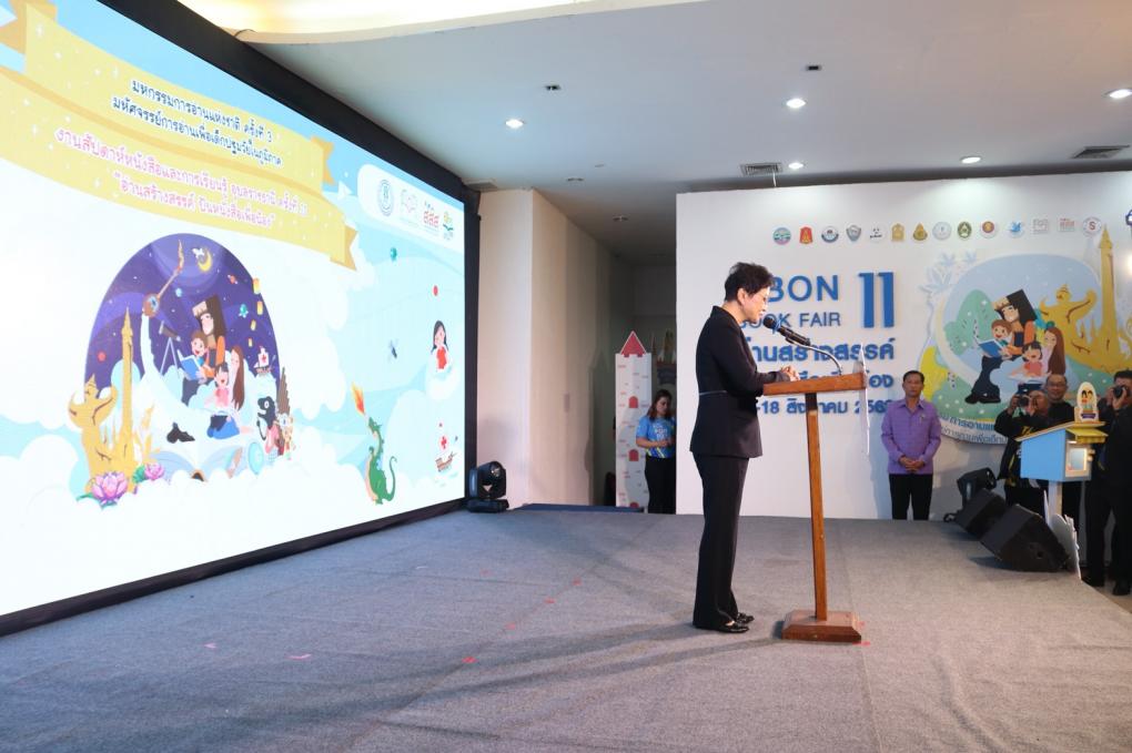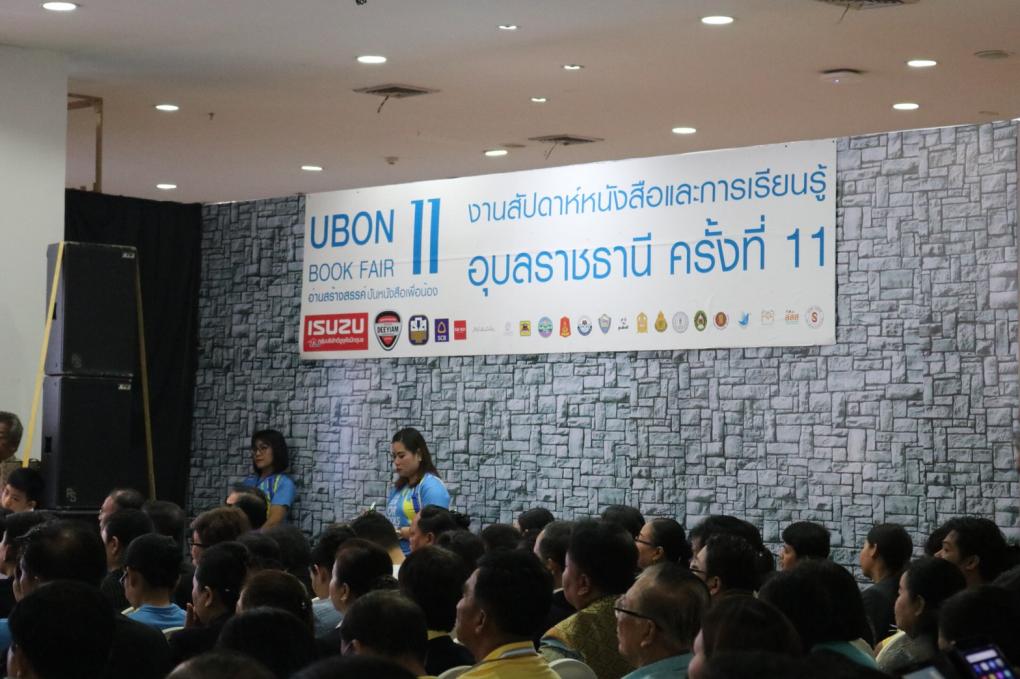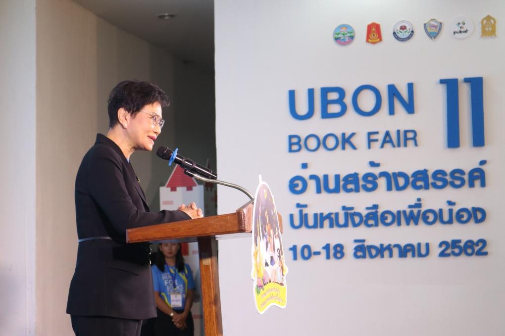 โดยมี นางสุนีย์ ตริยางกูรศรี ประธานกรรมการบริษัทสินทรัพย์ก้าวหน้าคอร์ปอเรชั่น จำกัด ประธานคณะกรรมการดำเนินโครงการสัปดาห์หนังสือและการเรียนรู้ จังหวัดอุบลราชธานี ครั้งที่ 11 และนางสุดใจ พรหมเกิด ผู้จัดการแผนงานสร้างเสริมวัฒนธรรมการอ่าน กล่าวรายงาน