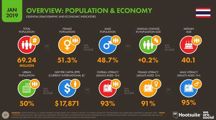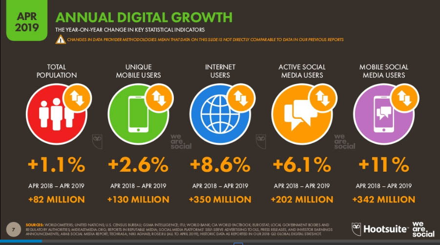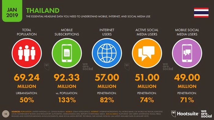 สถิติผู้ใช้ดิจิทัลทั่วโลก 2019 โดย “Hootsuite” ผู้ให้บริการระบบจัดการ Social Media และ Marketing Solutions ได้รวบรวมสถิติการใช้งานอินเทอร์เน็ตทั่วโลก เพื่อฉายภาพการเปลี่ยนแปลงทั้งภาคธุรกิจออนไลน์ และพฤติกรรมการใช้อินเทอร์เน็ตของผู้บริโภคในแต่ละประเทศ ได้เผยว่าขณะนี้มีผู้ใช้งานอินเทอร์เน็ตมากกว่า 4,400 ล้านคนทั่วโลก มือถือมากกว่า 5,100 ล้านคน บัญชีโซเชียลกว่า 3,400 บัญชี