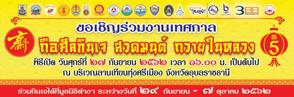 หอการค้าจังหวัดอุบลราชธานีและ ปกติเอกชนรวมถึงมูลนิธิต่างๆ ที่ร่วมจัดงานเทศกาล "ถือศีลกินเจ สวดมนต์ ถวายในหลวง" ปีที่ 5 ในปีนี้ ขอเชิญชวนประชาชนชาวจังหวัดอุบลราชธานีและจังหวัดใกล้เคียงร่วม งานบุญงานกุศลละเว้น เนื้อสัตว์ ทานผัก ทานอาหารเจเพื่อสุขภาพที่ดีและมีความสุข ตลอดจนร่วมพิธีสวดมนต์ เดินธูปแบบประเพณี วัฒนธรรมจีน พร้อมรับชมการเชิดมังกรที่ยิ่งใหญ่ที่สุดในแถบ อีสานตอนล่าง โดย มูลนิธิศิษย์พระจี้กงจังหวัดอุบลราชธานี.
