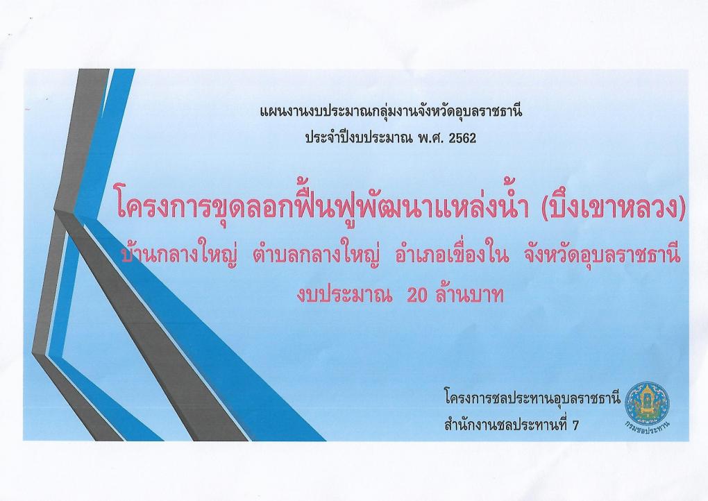 2.โครงการขุดพลอกฟื้นฟูพัฒนาแหล่งน้ำ (บึงเขาหลวง) บ้านกลางใหญ่ ตำบลกลางใหญ่ อำเภอเขื่องใน จังหวัดอุบลราชธานี งบประมาณ 20 ล้านบาท