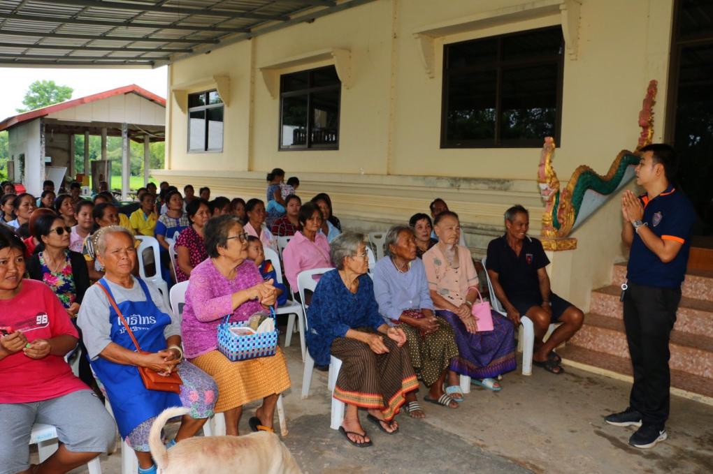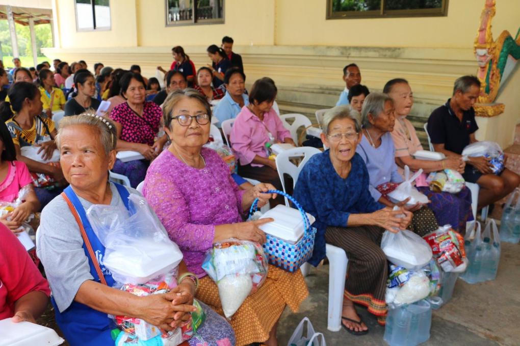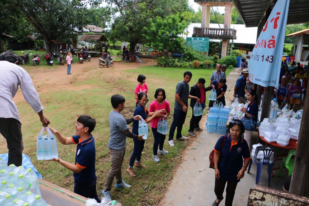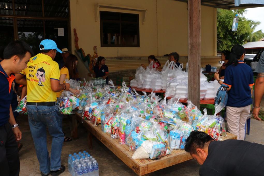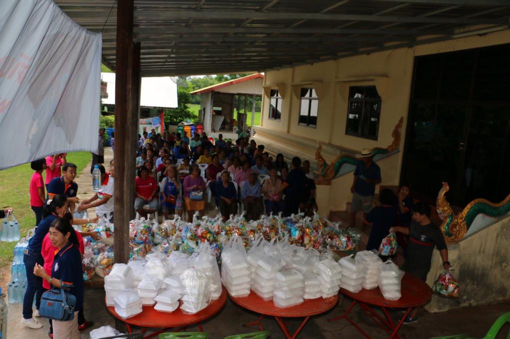 จุดที่ 2 วัดสังขะเสนาราม บ.ม่วงเฒ่า ต.หัวนา อ.เขมราฐ โดยมีผู้ใหญ่บ้านนายเตรียม ทานาฤทัย นายจตุพร เนื่องโนราช ผู้อำนวยการโรงเรียน บ.ม่วงเฒ่า และชาวบ้านผู้ประสบภัยน้ำท่วม จำนวน 150 คน เป็นผู้รับมอบ ข้าวกล่อง จำนวน 225 กล่อง ถุงยังชีพ จำนวน 200 ชุด และ น้ำดื่มจำนวน 158 แพค