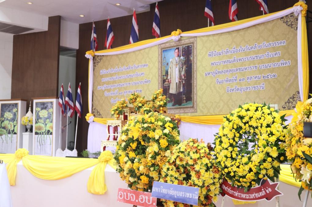 วันที่ 13 ตุลาคม 2562 เวลา 08.00 น. ณ หอประชุมจังหวัดอุบลราชธานี (ด้านหลัง ศาลากลางจังหวัดอุบลราชธานี) หอการค้าจังหวัดอุบลราชธานี นำโดย นายนิมิต สิทธิไตรย์ ประธานหอการค้าจังหวัดอุบลราชธานี พร้อมด้วยคณะกรรมการหอการค้าจังหวัดอุบลราชธานี ร่วมพิธีวางพวงมาลาและพิธีถวายบังคม ในพิธีน้อมรำลึกเนื่องในวันคล้ายวันสวรรคตพระบาทสมเด็จพระบรมชนกาธิเบศร มหาภูมิพลอดุลยเดชมหาราช บรมนาถบพิตร โดยมี นายสฤษดิ์ วิฑูรย์ ผู้ว่าราชการจังหวัดอุบลราชธานี เป็นประธานในพิธี