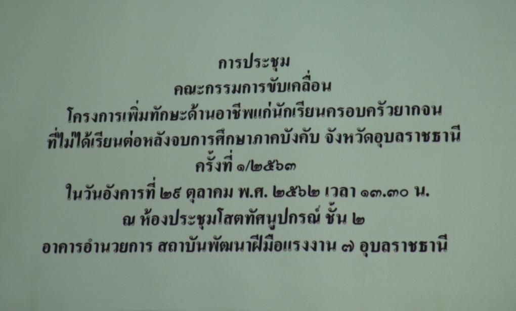 ด้วยจังหวัดอุบลราชธานี ได้มีคำสั่งแต่งตั้งคณะกรรมการขับเคลื่อนโครงการเพิ่มทักษะด้านอาชีพแก่นักเรียนครอบครัวยากจนที่ไม่ได้เรียนต่อหลังจบการศึกษาภาคบังคับ จังหวัดอุบลราชธานี เพื่อส่งเสริมและสนับสนุน รวมทั้งประสานความร่วมมือในการพัฒนานักเรียนที่จบการศึกษาภาคบังคับที่มีฐานะยากจนและขาดโอกาสในการศึกษาต่อในพื้นที่ จังหวัดอุบลราชธานี ให้มีทักษะด้านอาชีพในการเข้าสู่ตลาดแรงงานในฐานะ "แรงงานฝีมือ" เพื่อหารายได้ช่วยครอบครัวให้มีความมั่นคงทางอาชีพและมีคุณภาพชีวิตที่ดี