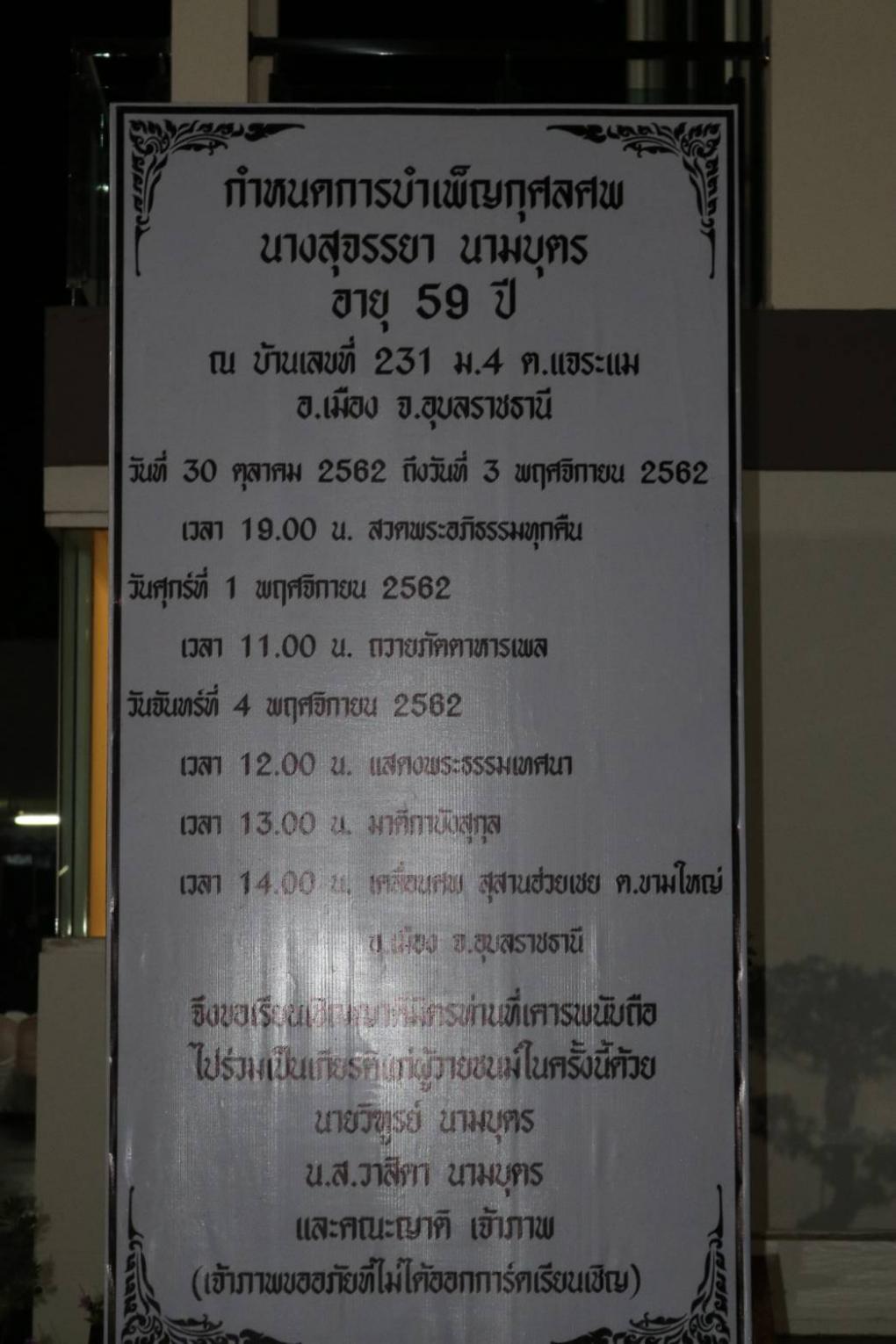 วันที่ 30 ตุลาคม 2562 เวลา 19.00 น. ณ บ้านเลขที่ 231 หมู่ 4 ตำบลแจระแม อำเภอเมืองอุบลราชธานี จังหวัดอุบลราชธานี หอการค้าจังหวัดอุบลราชธานี ร่วมเป็นเจ้าภาพสวดพระอภิธรรม นางสุจรรยา นามบุตร ภริยาท่าน สส.วิฑูรย์ นามบุตร