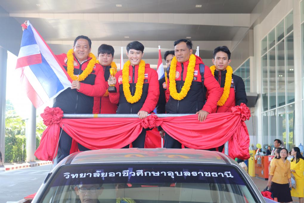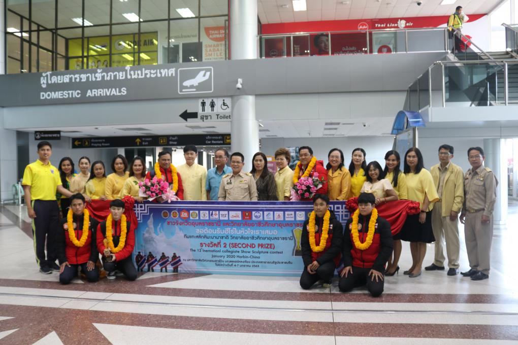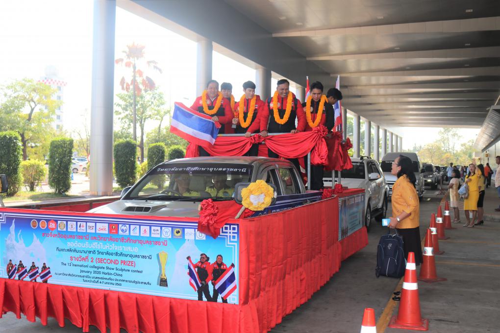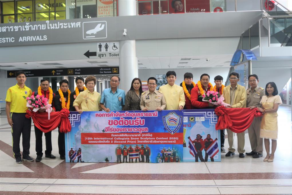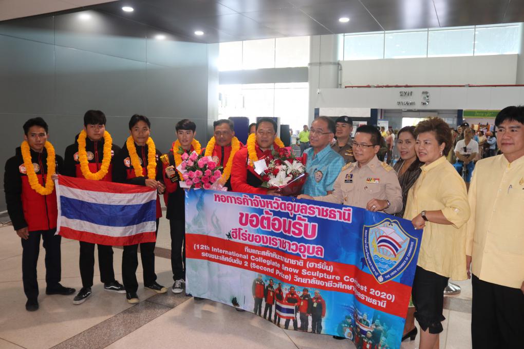 วันที่ 13 มกราคม 2563 เวลา 13.00 น. ณ สนามบินอุบลราชธานี จังหวัดอุบลราชธานี โดย นายอุทัย ทองเดช รองผู้ว่าราชการจังหวัดอุบลราชธานี , ดร.พงษ์ศักดิพล ทาแก้ว ผู้อำนวยการวิทยาลัยเทคนิคเดชอุดม รักษาการในตำแหน่งผู้อำนวยการวิทยาลัยอาชีวศึกษาอุบลราชธานี, หอการค้าจังหวัดอุบลราชธานี โดย นายนิมิต สิทธิไตรย์ ประธานหอการค้าจังหวัดอุบลราชธานี และนางรัตนากร ฑีฆธนานนท์ กรรมการเลขาธิการหอการค้าจังหวัดอุบลราชธานี และคณะร่วมต้อนรับทีมฮีโร่แกะสลักหิมะนานาชาติวิทยาลัยอาชีวศึกษาอุบลราชธานีรางวัลซีไรต์รางวัลที่ 2 ในการแข่งขันการแกะสลักหิมะนานาชาติ (12th International Collegiate Snow Sculpture Contest 2020) ณ มหาวิทยาลัยวิศวกรรมฮาร์บิ้น มณฑลเฮย์หลงเจียง ประเทศสาธารณรัฐประชาชนจีน เมื่อวันที่ 4-7 มกราคม 2563 ที่ผ่านมา