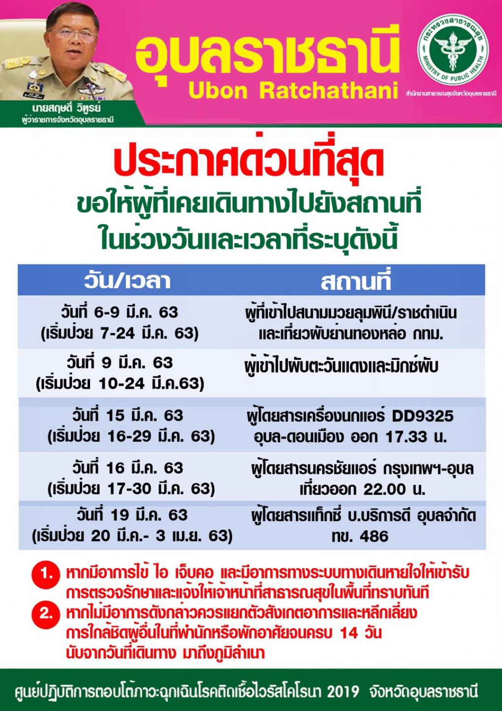 ด่วน!ที่สุด จังหวัดอุบลราชธานี สั่งปิดสถานบริการดังต่อไปนี้ 1.ให้ปิดสถานที่ในพื้นที่จังหวัดอุบลราชธานี(รายละเอียดตามประกาศจังหวัด) จนถึงวันที่31มีนาคม 2563 2.ให้ปิดสถานที่(ตามรายละเอียดประกาศจังหวัด) จนกว่าสถานการณ์การแพร่ระบาดของโรค Covid-19 จะคลี่คลาย 3.ให้งดจัดงานหรือกิจกรรมที่รวมคนจำนวนมากและมีความเสี่ยงสูงต่อการแพร่ระบาดของโรค Covid-19 เช่น คอนเสิร์ต งานบุญประเพณี งานมงคล งานอวมงคลที่มีดนตรี ฯลฯ 4.กำหนดเวลาปิดร้านอาหารและการจัดโต๊ะอาหาร รายละเอียดให้อ่านจากประกาศจังหวัดอุบลราชธานี ฉบับที่3/2563 ประกาศ ณ วันที่22 มีนาคม 2563 นพพร พันธุ์เพ็ง กรรมการสมาคมสื่อมวลชนอุบลราชธานี รายงาน 22 มีนาคม 2563 เวลา 16.52 น