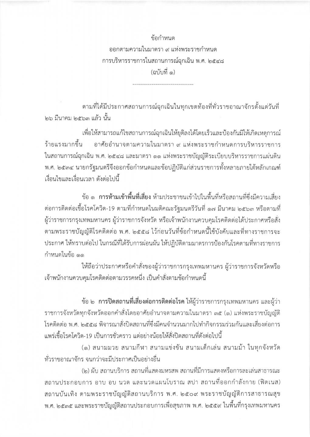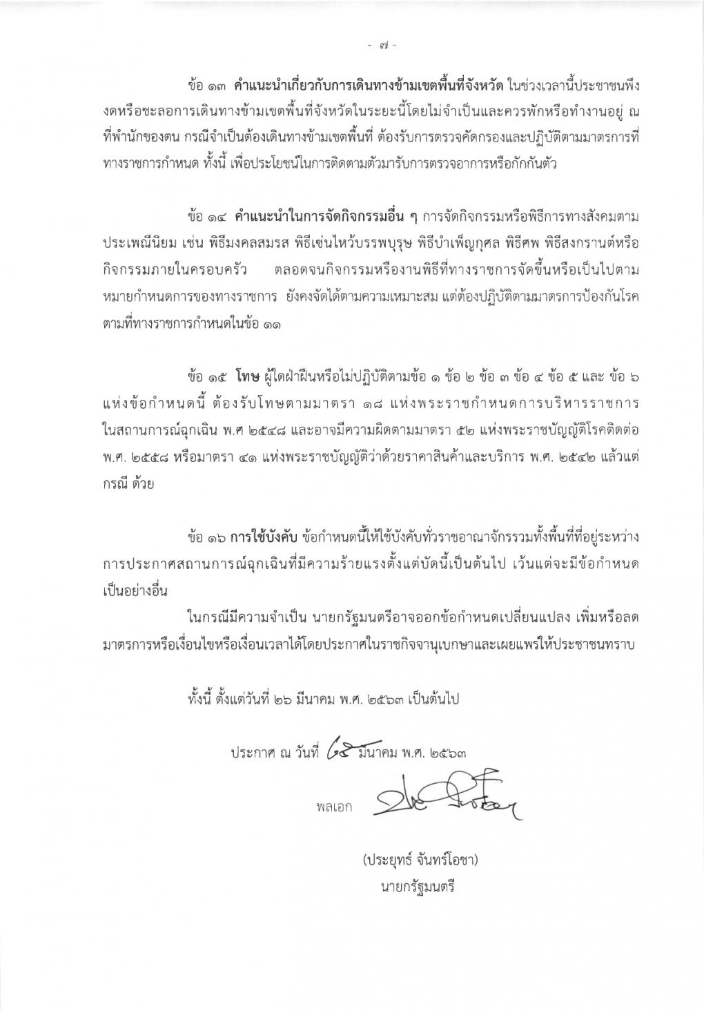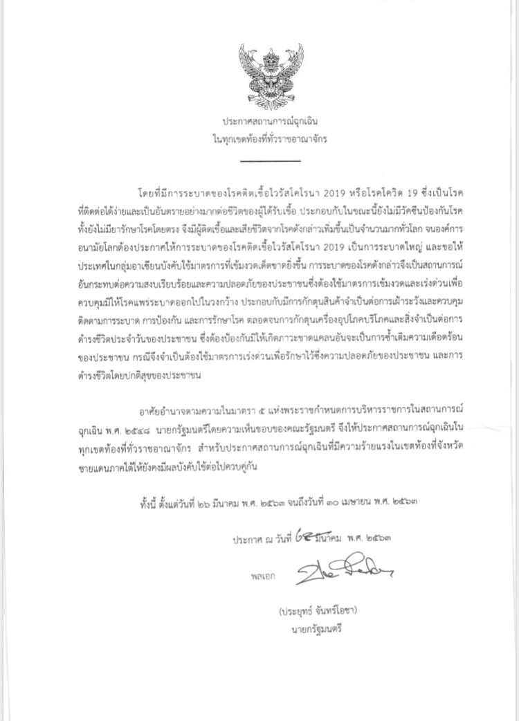 8. ประกาศสถานการณ์ฉุกเฉินนี้บังคับใช้ทั่วประเทศ (ทุกจังหวัด) มีผลตั้งแต่วันที่ 26/03/63 ไปจนถึงวันที่ 30/04/63
