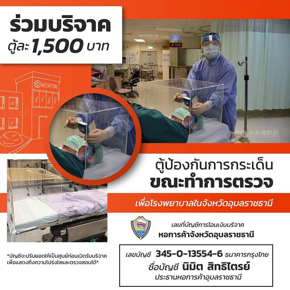 หอการค้าจังหวัดอุบลราชธานี ขอเป็นสื่อกลางในการรับบริจาคเงิน เพื่อจัดทำอุปกรณ์ช่วยป้องกันสารคัดหลั่งของผู้ป่วย มอบให้ทีมแพทย์และพยาบาลเพื่อสู้กับเชื้อไวรัสโควิด-19 ในโรงพยาบาลต่างๆ ในเขตพื้นที่จังหวัดอุบลราชธานี