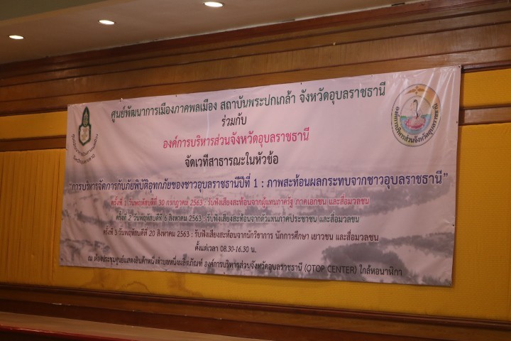 วันที่ 30 กรกฎาคม 2563 เวลา 08.00 น. ณ ห้องประชุมศูนย์แสดงสินค้าหนึ่งตำบลหนึ่งผลิตภัณฑ์ องค์การบริหารส่วนจังหวัดอุบลราชธานี (OTOP Center) นายมงคล จุลทัศน์ รองประธานหอการค้าจังหวัดอุบลราชธานี ร่วมประชุมโครงการการบริหารจัดการกับภัยพิบัติอุทกภัยของชาวอุบลราชธานีปีที่ 1 : ภาพสะท้อนผลกระทบจากชาวอุบลราชธานี จัดโดยศูนย์พัฒนาการเมืองภาคพลเมือง สถาบันพระปกเกล้า จังหวัดอุบลราชธานี ร่วมกับองค์การบริหารส่วนจังหวัดอุบลราชธานี โดยได้นำเสนอข้อมูลอุทกภัยโดยภาพรวมของจังหวัดอุบลราชธานี ปี 2562 ผ่าน PowerPoint และข่าวจากสื่อต่างๆ และเปิดเวทีภาพสะท้อนผลกระทบจากน้ำท่วมจากผู้เข้าร่วมโครงการ และได้มีการประมวลสรุปความคิดเห็นจากเวทีพร้อมทั้งรับฟังความคิดเห็นเพิ่มเติม โดยผู้แทนของศูนย์พัฒนาการเมืองภาคพลเมือง สถาบันพระปกเกล้า จังหวัดอุบลราชธานี, ตัวแทนนักวิชาการ, ตัวแทนสื่อมวลชน และได้มีข้อสรุปความคิดเห็นปัญหาจากเวทีตลอดทั้งวัน.