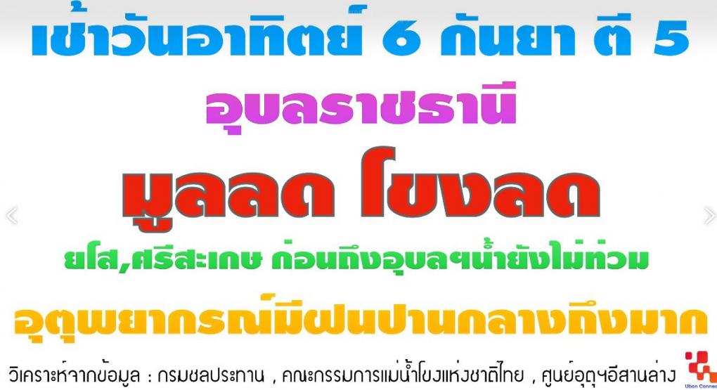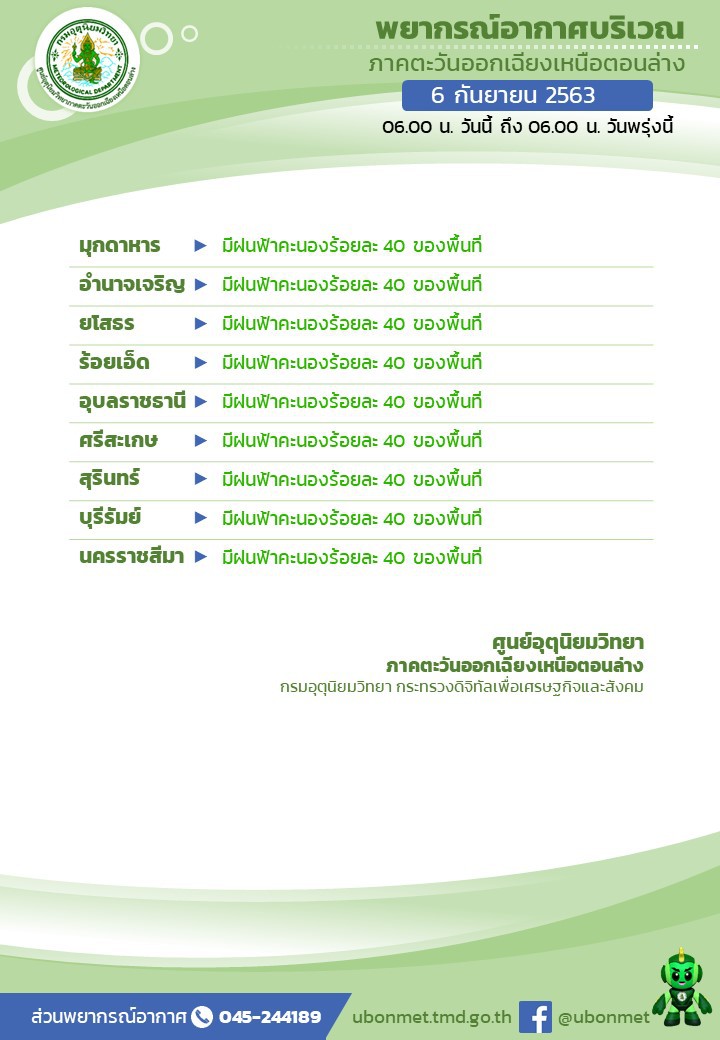 อุตุอุบลฯพยากรณ์ วันนี้ (6 กันยายน) อุบลฯบ้านเราจะมีฝนปานกลางถึงมาก 40% ของพื้นที่ ฝนสะสม 24 ชั่วโมง ข้อมูลของกรมอุตุฯ ฝนลงแยะ ที่น้ำยืน ศรีเมืองใหม่ โขงเจียม เขมราฐ และ เรด้าห์อุตุอุบลฯแสดง ฝนกำลังจ่อแถวบุณฑริก