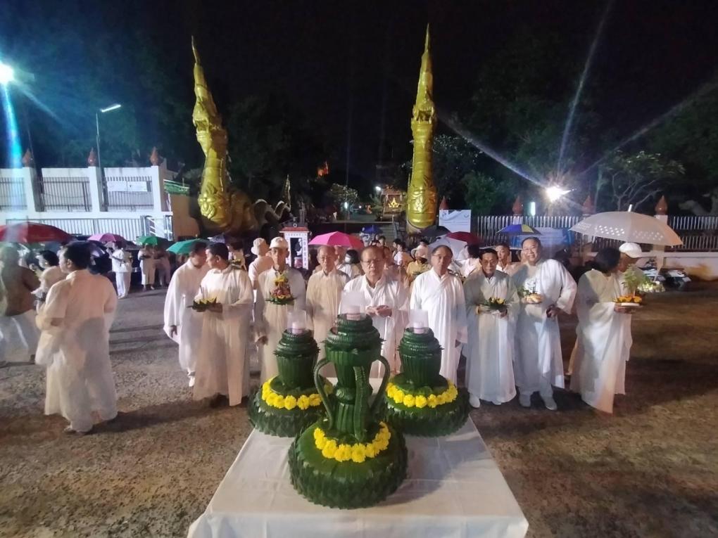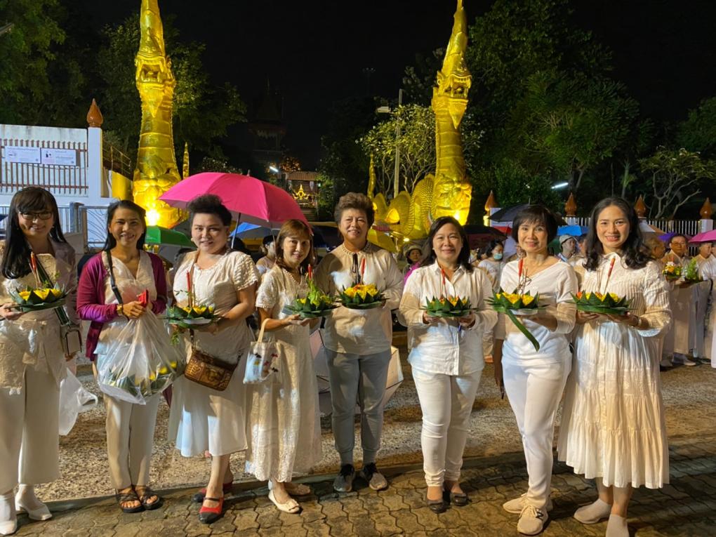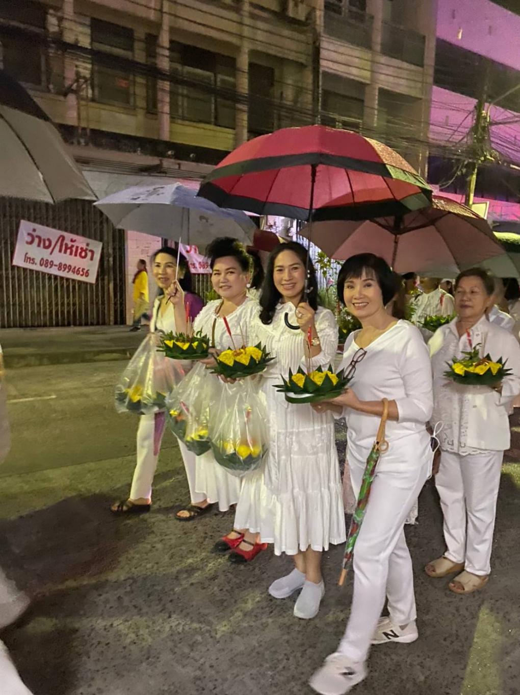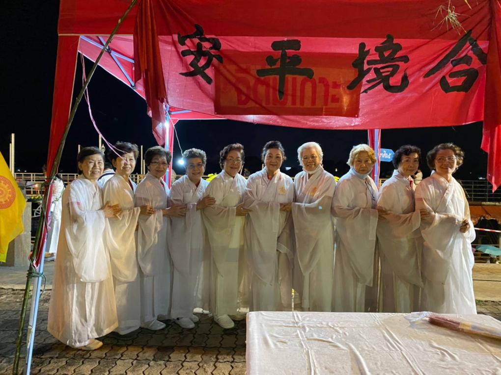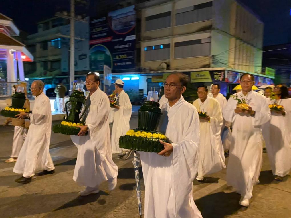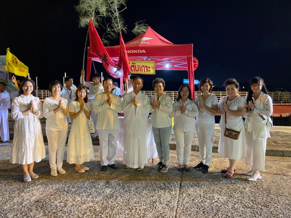 ร่วมพิธีสวดมนต์เวียนธูป โดยเคลื่อนขบวนจากมูลนิธิการกุศลอุบลราชธานี ส่วนสังคมสงเคราะห์ จีตัมเกาะ มาถึงบริเวณท่าน้ำวัดหลวง เพื่อทำพิธีลอยกระทง คล้ายการลอยกระทงของคนไทย เพื่อขอบคุณเจ้าแม่คงคา เพื่อขอพรให้ผู้ถือศีลกินเจมีสุขภาพแข็งแรง และขอพรให้เทพเจ้าปกป้องคุ้มครองให้พ้นจากโรคภัยทั้งปวง เป็นการสะเดาะเคราะห์ ต่อดวงชะตา ปล่อยทุกข์โศกบาปเคราะห์ให้ลอยไปกับกระทง และเป็นการส่งเทพเจ้าขึ้นสู่สรวงสวรรค์ เนื่องจากวันนี้เป็นวันสุดท้ายของประเพณีถือศีลกินเจ ปี 2563