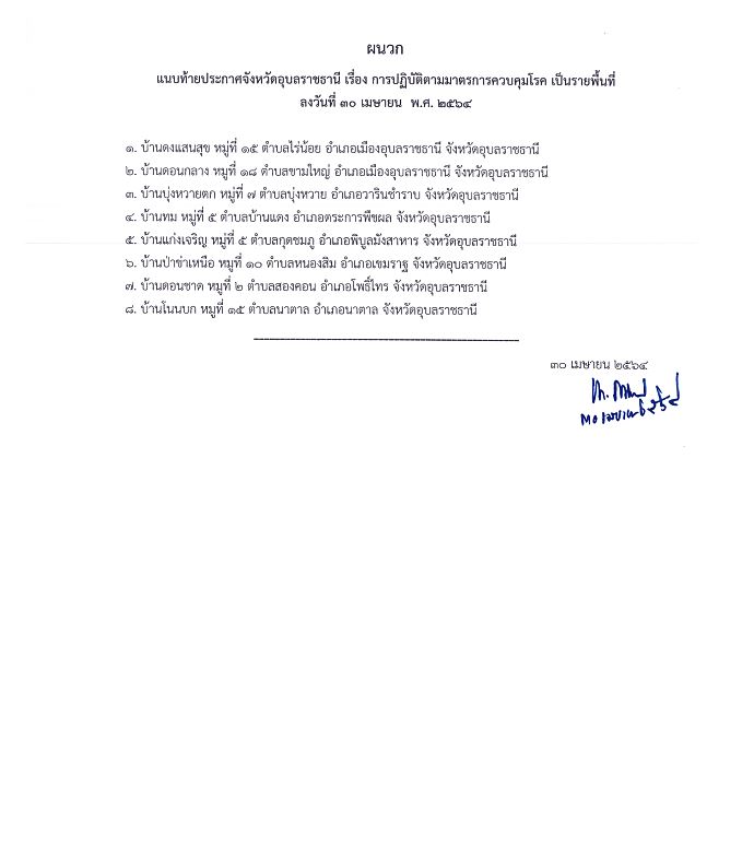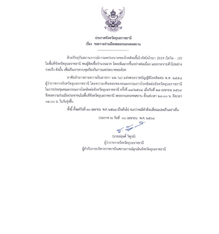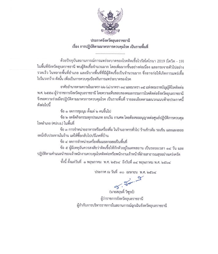 จังหวัดอุบลราชธานี ได้ ประกาศมาตรการในการกำกับควบคุม แก้ไขปัญหาโควิด-19 เพื่อขอความร่วมมือปฎิบัติอย่างเคร่งครัด และสามารถควบคุมการระบาด ของโรคให้อยุู่ในพื้นที่วงจำกัด