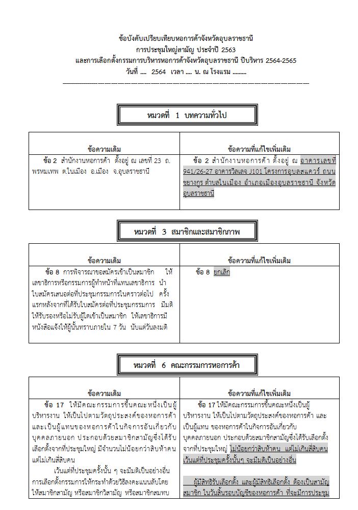 ร่าง การแก้ไขข้อคับหอการค้าฯ ที่ คณะกรรมการหอการค้าจังหวัดอุบลราชธานีได้พิจารณษ มีมติ เมื่อวันที่ 5 พฤษภาคม 2564 และจะนำเสนอที่ประชุมใหญ่หอการค้าจังหวัดอุบลราชธานีพิจารณา รับรองในวันที่ 20 พฤษภาคม 2564 นี้