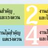 4 ช่อง คือ......1.สำคัญ - เร่งด่วน > ทำ...2.สำคัญ - ไม่เร่งด่วน > วางแผนให้ดี ตรงนี้จุดนี้สำคัญสุด เพราะเรามักจะไม่มีเวลาให้ช่องนี้ 3.ไม่สำคัญ - เร่งด่วน > พยายามให้คนอื่นทำแทน....4.ไม่สำคัญ - ไม่เร่งด่วน > พยายามกำจัดทิ้ง